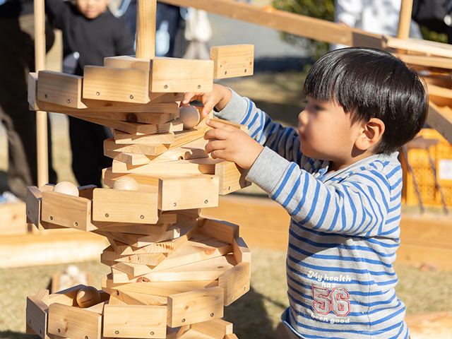 オクシズ材(静岡市資産材)で作られた木の積み木「シズレンガ」で遊ぶ