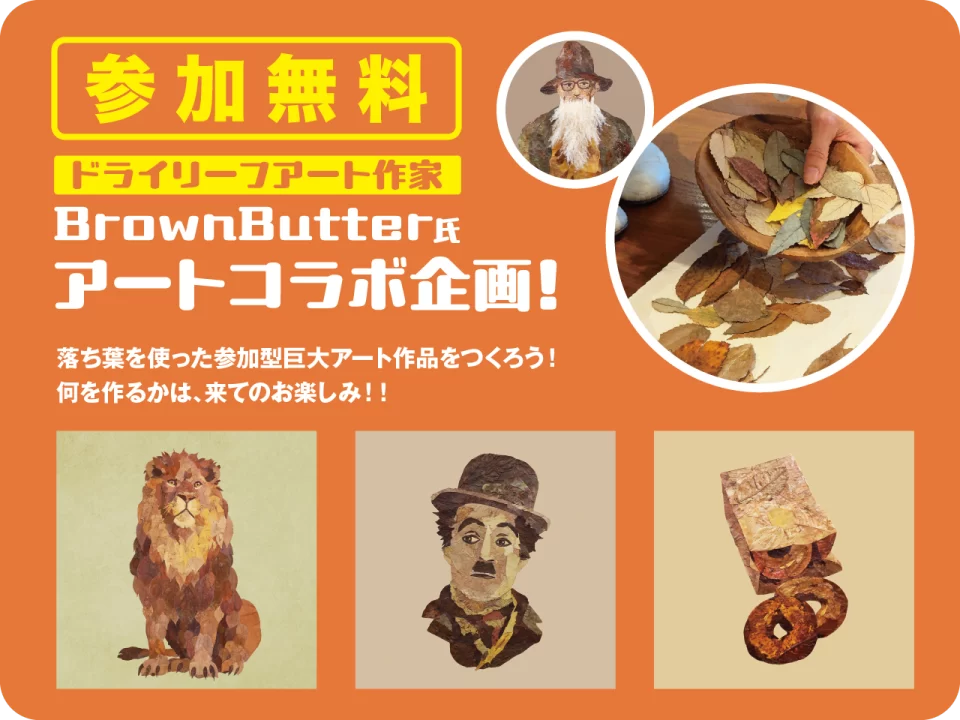 BrownButter氏アートコラボ 参加無料 11月29日(土)・30日(日) ドライリーフアート作家「BrownButter」氏とのアートコラボ企画! 産業フェアしずおかで、 落ち葉を使った参加型巨大アート作品をつくろう! 何を作るかは、来てのお楽しみ!!